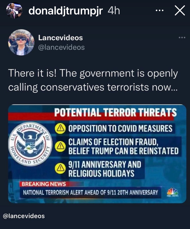The U.S. Army National Guard is recruiting for a job position described as “Internment/Resettlement Specialist” at the same time the Department of Homeland Security is putting out alerts on “potential terrorist threats” that appear to equate Americans opposing government Covid measures with foreign terrorists who attacked America on 9/11. NBC News on Friday, Aug. 13, … Continue reading DHS issues terror alert equating Americans who oppose government Covid restrictions with 9/11 terrorists
