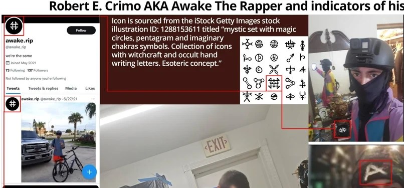 In his social media and rapper promotions, Crimo uses a set of icons from Getty Images titled “mystic set with magic circles, pentagrams and imaginary chakras symbols, and a collection of icons with witchcraft and occult handwriting letters.”