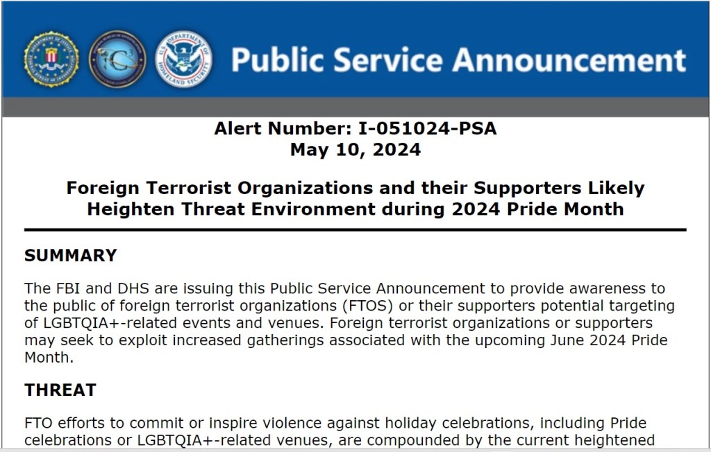 “Foreign terrorist organizations or supporters may seek to exploit increased gatherings associated with the upcoming June 2024 Pride Month.”